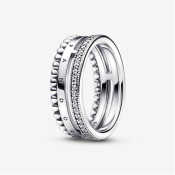 Pandora S925 Sterling Silver Signature Logo Pavé & Beads Ring
